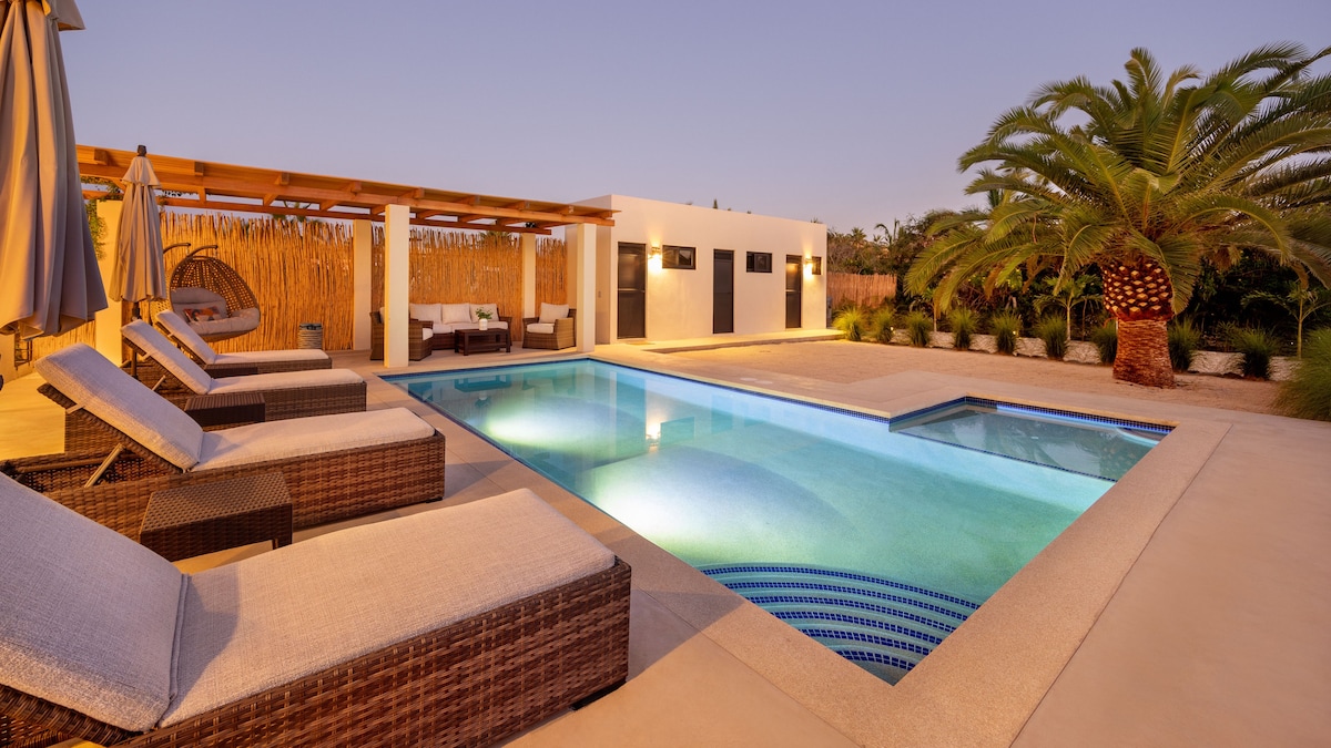 This stunning Cerritos beach home features spacious decks, fire pits, yoga zones, and a heated 10-foot deep pool with a sun-shelf. Unwind in the rooftop hot tub, cold Plunge or sauna, and enjoy indoor/outdoor kitchens and dining areas, complete with hammocks. Just a short walk to the beach, grocery stores, bars, and restaurants, you can explore the vibrant area or relax in your private desert sanctuary. Experience comfort and elegance in this serene Baja escape, where leaving is optional!