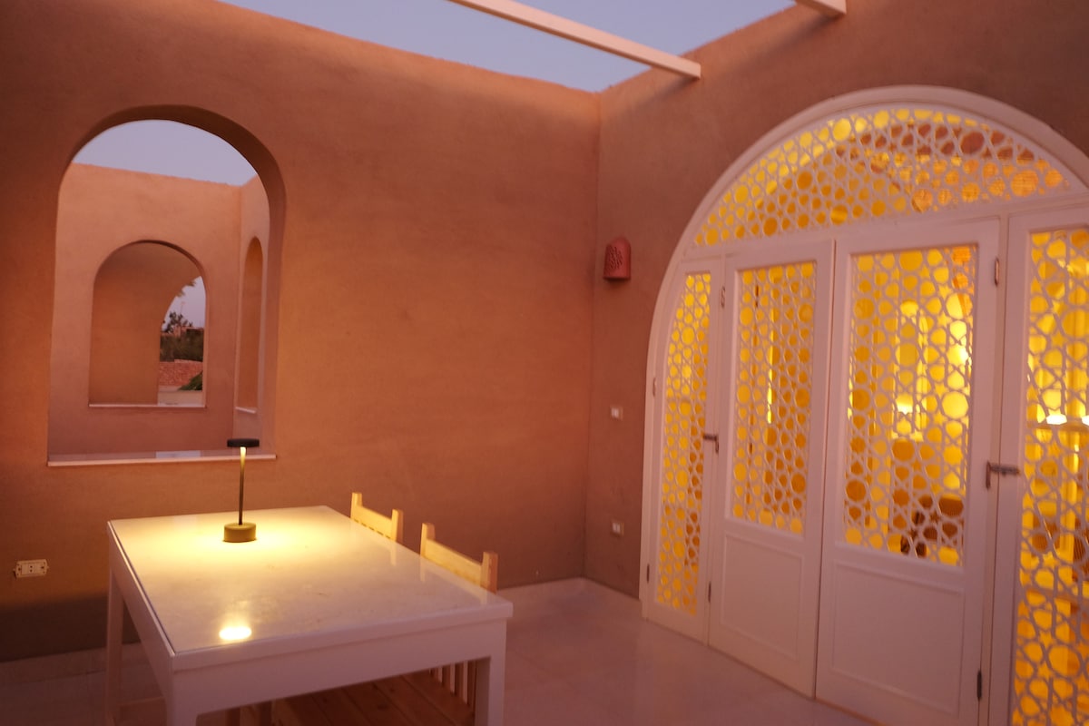 A delightful two floor space with internal stairs, large dome bedroom on the 2nd floor, large private roof terrace with spectacular mountain views , with valley of the queens straight ahead , a super peaceful location set in traditional farmlands, but 7 mins walk to Medinat Habu the nearest temple, so you can enjoy the peaceful magic of Luxor after a busy day visiting the temples. A place to just be.