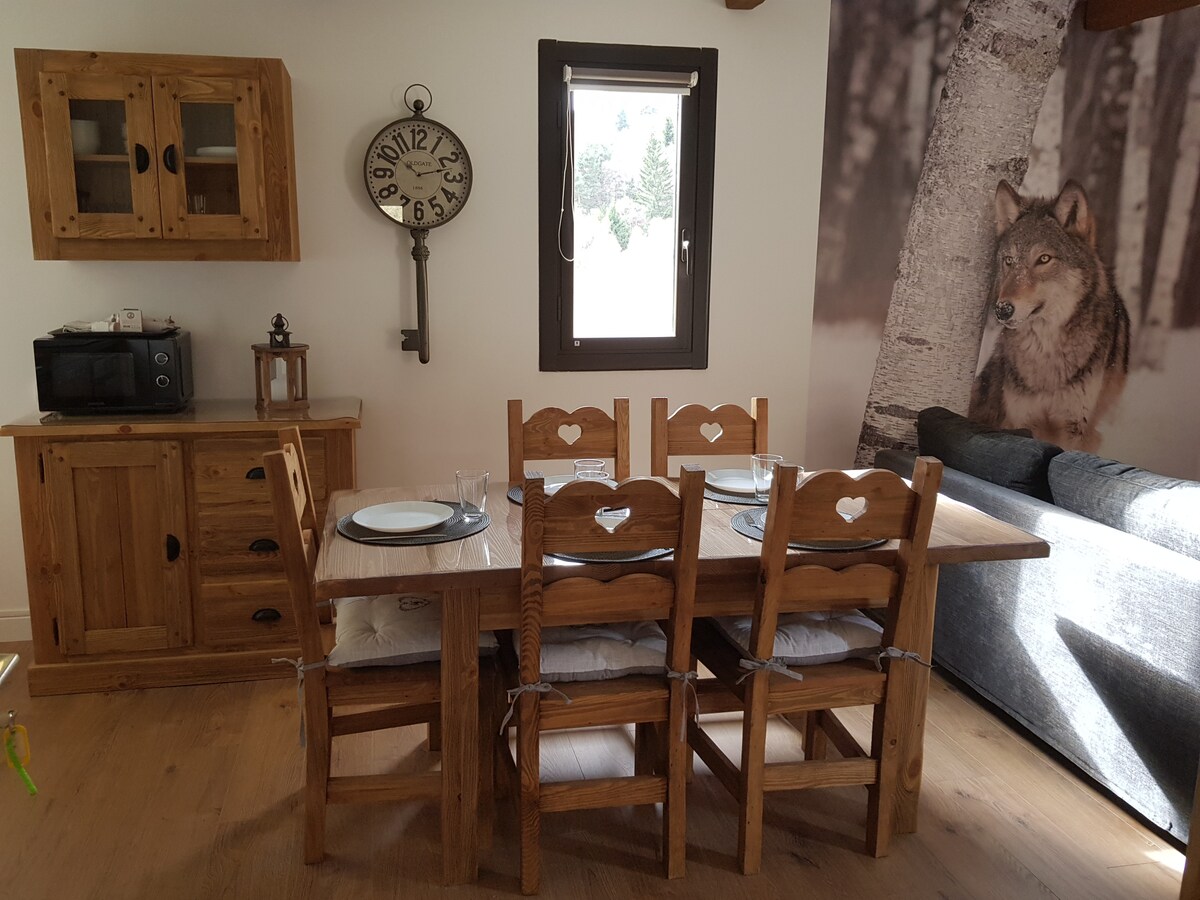 Denne unike boligen har sin egen personlighet. Leilighet for 6 personer. Med terrasse. Plassert ved foten av Sky-løypa. Med gratis privat parkering. Den har alt du trenger for et komfortabelt og hjemmekoselig opphold. Den har tre soverom. Ett av dem er utstyrt for fjernarbeid. Kjøkken, bad, stue og terrasse i hovedrommet. 60-tommers TV, med forskjellige underholdningsplattformer. Du vil føle deg som om du er i en hytte omgitt av natur og snø.