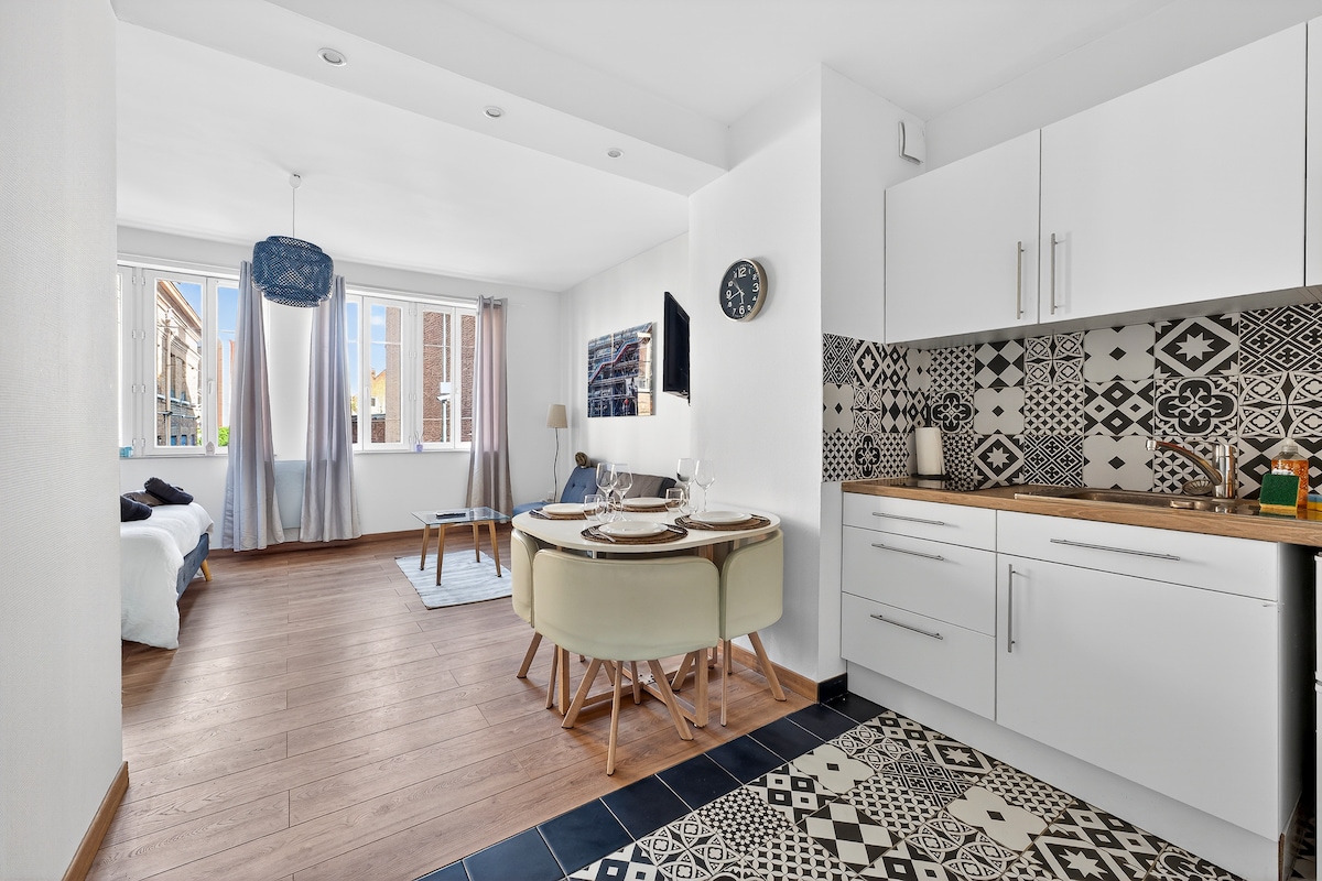 🌸 ATYPISK HUS av Julie & Mickael🌸 Slapp av i denne rolige og elegante boligen 65 m2 atypisk bolig i industriell stil som ligger i hjertet av Lens sentrum. Beliggenheten er ideell, mindre enn 100 meter fra aktiviteter som Louvre-museet, butikker og restauranter, bussholdeplass for å komme til jernbanestasjonen (som ligger 1,3 km unna) og fotballkamp på STADION BOLLAERT. terrasse og hage