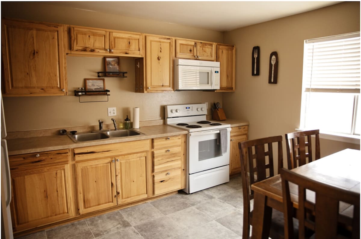 Suite #3. Completely remodeled one bdrm condo, incl. refrigerator, new microwave and electric range/oven. Wifi, new mini split heating and A/C w/remote, new (Jan. 2021) Sealy Ppedic queen bed w/800# sheets, semi fenced grass yard w/ large trees and fire pit. New subway tile bathroom w/rain shower head. Spectacular views of Balance Rock and the Book Cliffs, half block from Helper Main St. w/ Art Galleries, Antique stores, museums, restaurants including Angel's Cravings authentic taco stand!