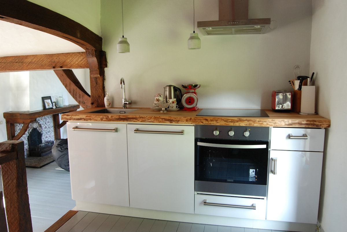 Vårt koselige, karakteristiske bakhus med et område på ikke mindre enn 120 kvm er en del av et stråtak fra 1862. Den har en privat inngang og rikelig med privatliv. Det er en vakker stor stue med eikebjelker og loft. Herfra har du en fantastisk vid utsikt over engene bak.