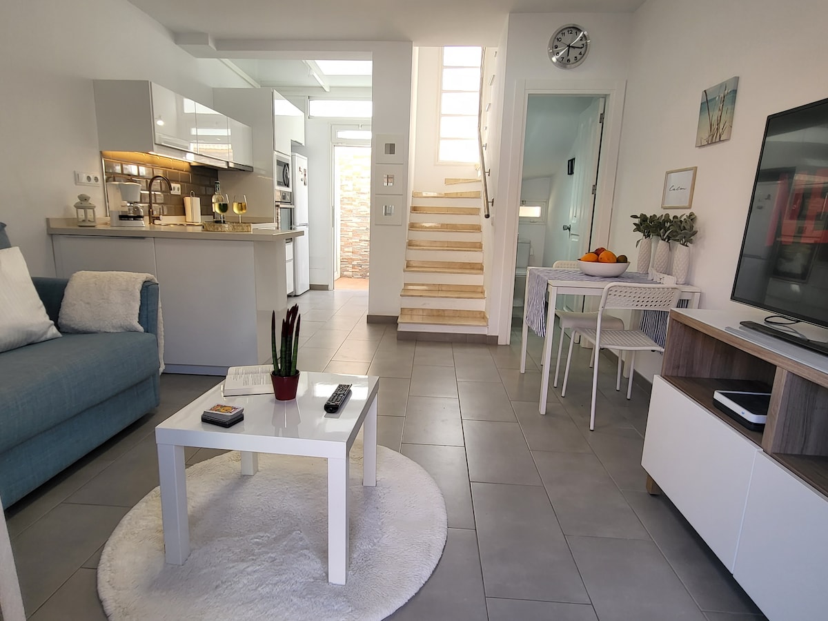 Hvis du ser etter fred og ro i en bungalow i et superrolig kompleks og nær alle omkringliggende tjenester som restauranter, kafeer, golfbane, svømmebasseng, buss og supermarked på 50 meter... Duplex 20 meter fra stranden. I første etasje: stue, bad, bad, kjøkken, kjøkken, vaskerom og terrasse med utsikt over hagen. Øvre etasje: to soverom, baderom og balkong med utsikt over hagen og bassenget. Den er utstyrt med klimaanlegg og trådløst nettverk.