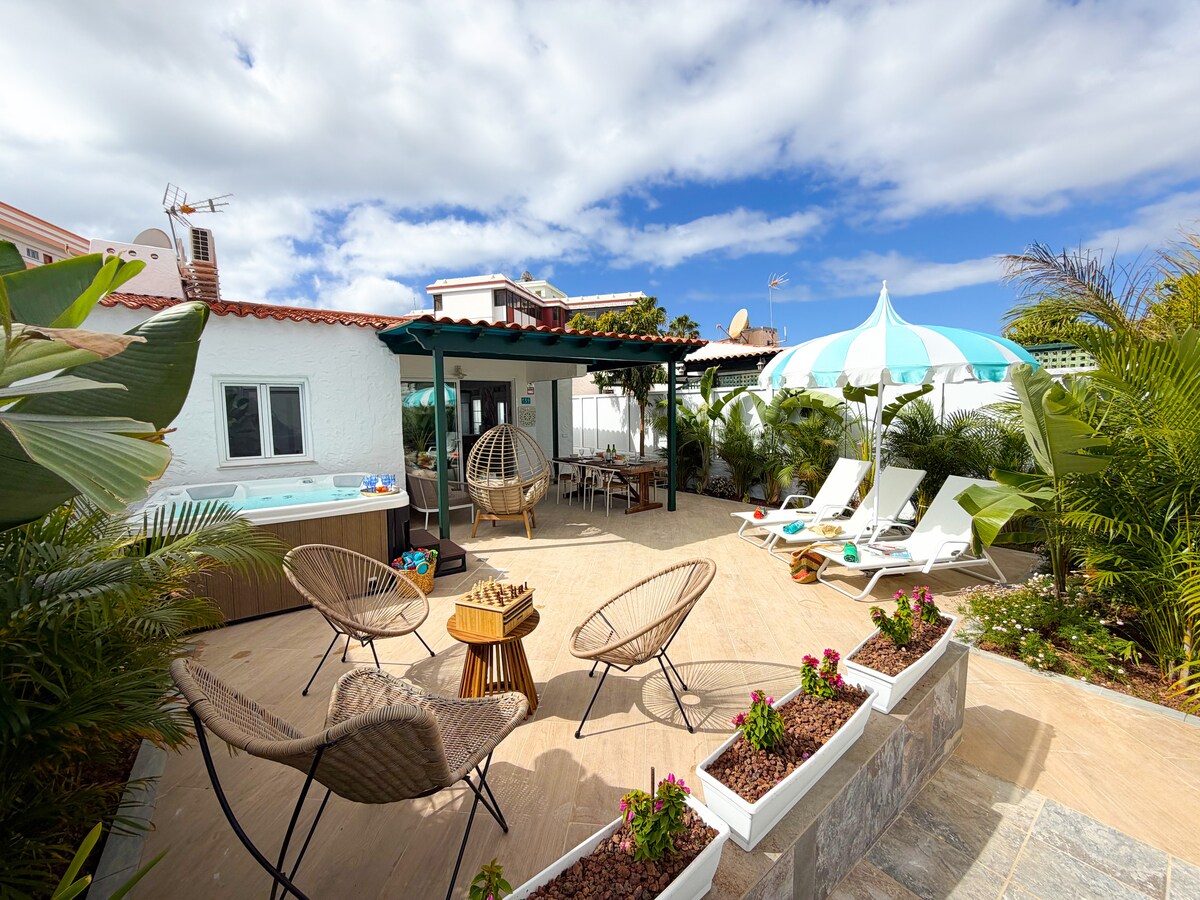 Koselig bungalow i hjertet av Playa del Inglés, noen minutter fra stranden. Den har to soverom med dobbeltsenger og en stor privat terrasse med utendørs spisestue, grill, solarium og avslapningsområde. Uavhengig tilgang fra gaten for ekstra privatliv. Komplekset tilbyr to felles bassenger og hager. Nær restauranter, kafeer og supermarkeder. Parkering gratis og nærliggende kollektivtransport. Ideell for å nyte solen og roen.