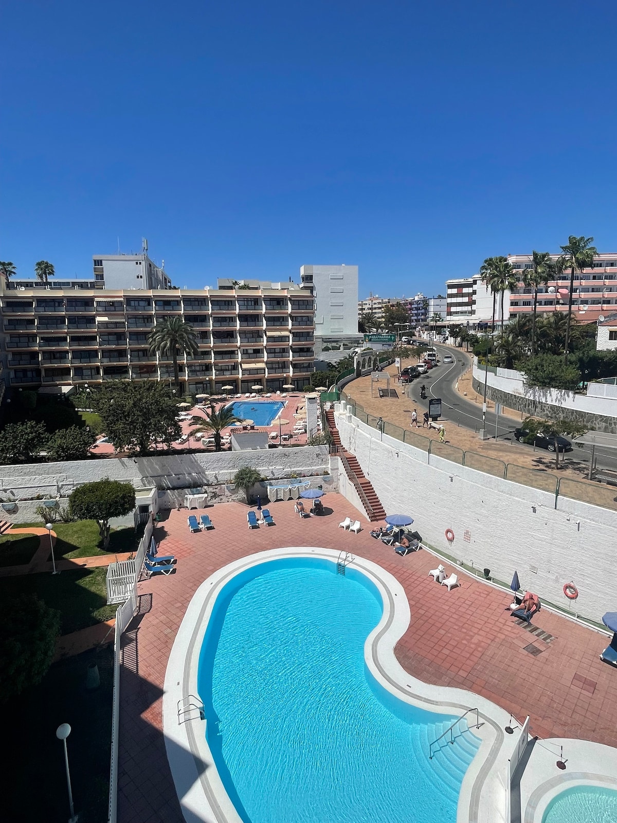 Leiligheten ligger i KOKA Apartments, i sentrum av Playa del Ingles, mindre enn 8 minutter fra CC Yumbo, Kasbah eller stranden. Vår misjon er å tilby deg en DELUXE-opplevelse. Leiligheten ble renovert i november 2023, og er fullt utstyrt: kjøkken, bad, soverom og en privat terrasse med utsikt over bassenget. Leiligheten er delt inn i to rom: Første etasje – soverom, stue og bad Øverste etasje – terrasse og kjøkken