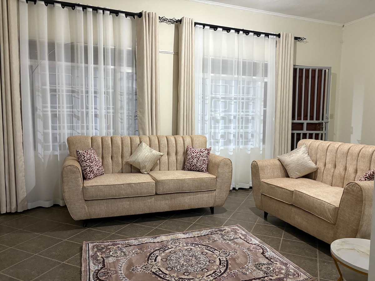 Flykt til en rolig dobbel etasje med fire soverom i Akright Citys prestisjefylte enklave. Perfekt for familieturer og sammenkomster med venner. Slapp av i en solbelyst stue, gå ut på en av to balkonger for utsikt mot solnedgangen, trekk deg tilbake til en luksuriøs hovedsuite med høyhastighets internett Din bekvemmelighet er avgjørende. Øst-tilgang til Voice Mall, eller en kort kjøretur til Victoria Mall og bredden av Lake Victoria. Med flyplassen minutter unna er det en ideell base for enhver tur.