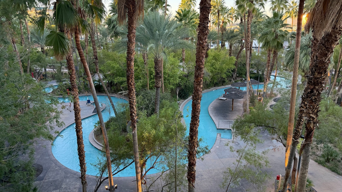 ✨Velkommen til din Vegas-oase! ✨ Nyt denne romslige 971 kvadratmeter. Suite med ett soverom – perfekt for reisende som ser etter komfort + feriestemning! 🛏 én kingsize-seng + én queensize-sovesofa 🍳 fullt kjøkken (kjøleskap i full størrelse, komfyr/stekeovn, mikrobølgeovn og oppvaskmaskin) 🛁 Luksusbad med dampdusj og boblebad. 🧺 Vaskemaskin og tørketrommel på stedet. Nyt full tilgang til fasiliteter på feriestedet, inkludert et oppvarmet basseng året rundt, en lazy river, boblebad, treningssenter og spisesteder på stedet. 🚫 Ingen rengjøringsgebyr. Ingen hotellavgifter. Gratis parkering.