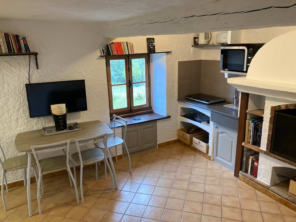 Hus som er en favoritt: gammel rehabilitert stall, 80 m2 totalrenovert, under eiketrær, rolig, i naturen. Boligen ligger i utkanten av et boligområde og i skogkanten, uten noen naboer i nærheten. 2 minutter med bil til alle fasiliteter (supermarkeder, restauranter, bakerier ...). Første etasje med fullt utstyrt stue, suite med bad, wc. Loftsetasje med 2 soverom, bad og toalett. Vannplan, provençalske markeder, termiske bad og nytt termisk spa, evobypark, verdon-juv ...