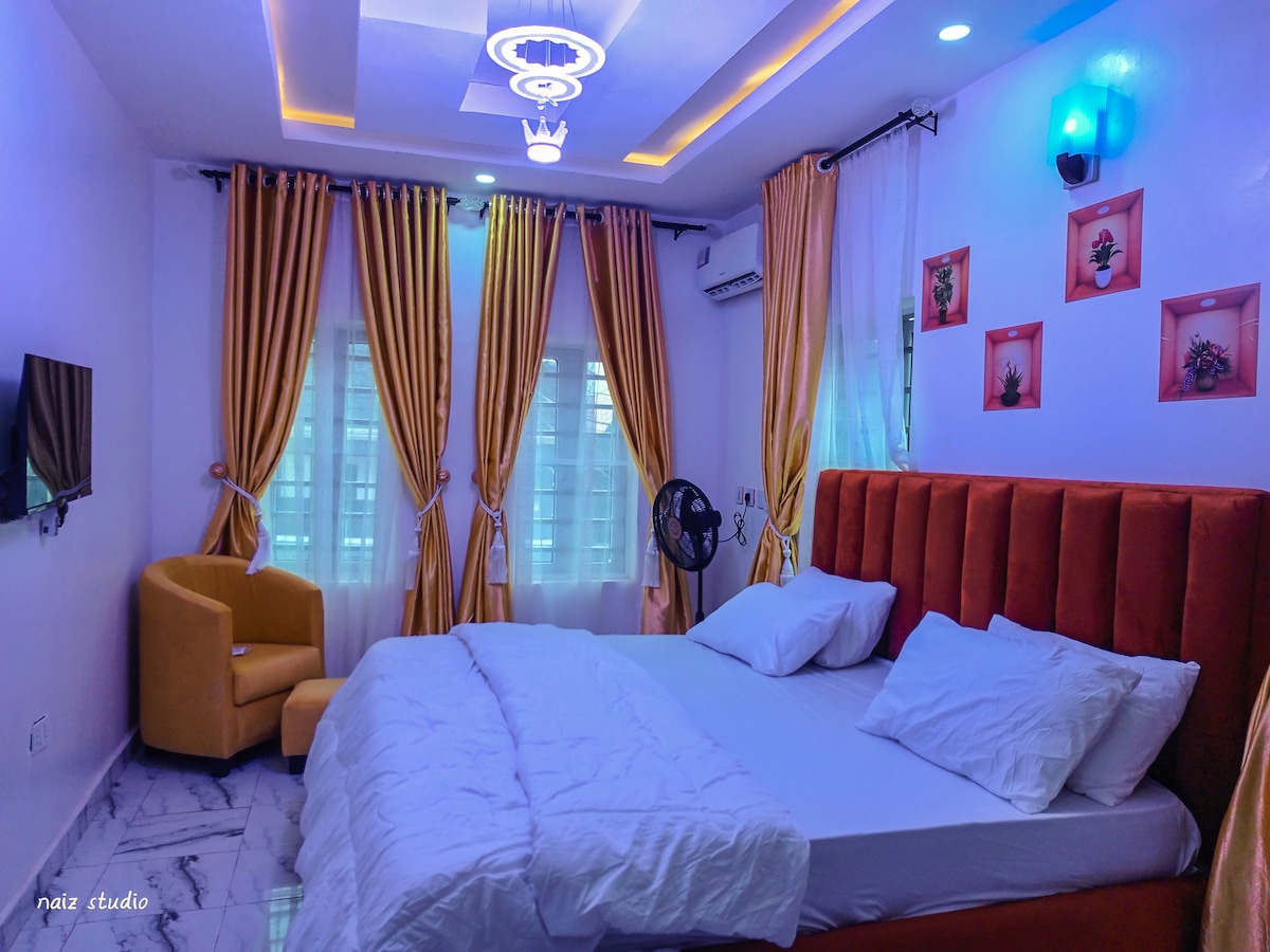 Velkommen til Prodigy Luxury Apartment – et stilig tilfluktssted hvor eleganse møter komfort. Den romslige leiligheten vår ligger i et trygt og fredelig nabolag, og tilbyr strøm og sikkerhet døgnet rundt for et bekymringsfritt opphold. Leiligheten drives fullt ut av solenergi, du vil nyte uavbrutt lys og nødvendigheter. Perfekt for gjester som ønsker ro, bekvemmelighet og et snev av luksus. Vær oppmerksom på at klimaanlegget og varmeapparatet ikke fungerer på grunn av solsystemet.