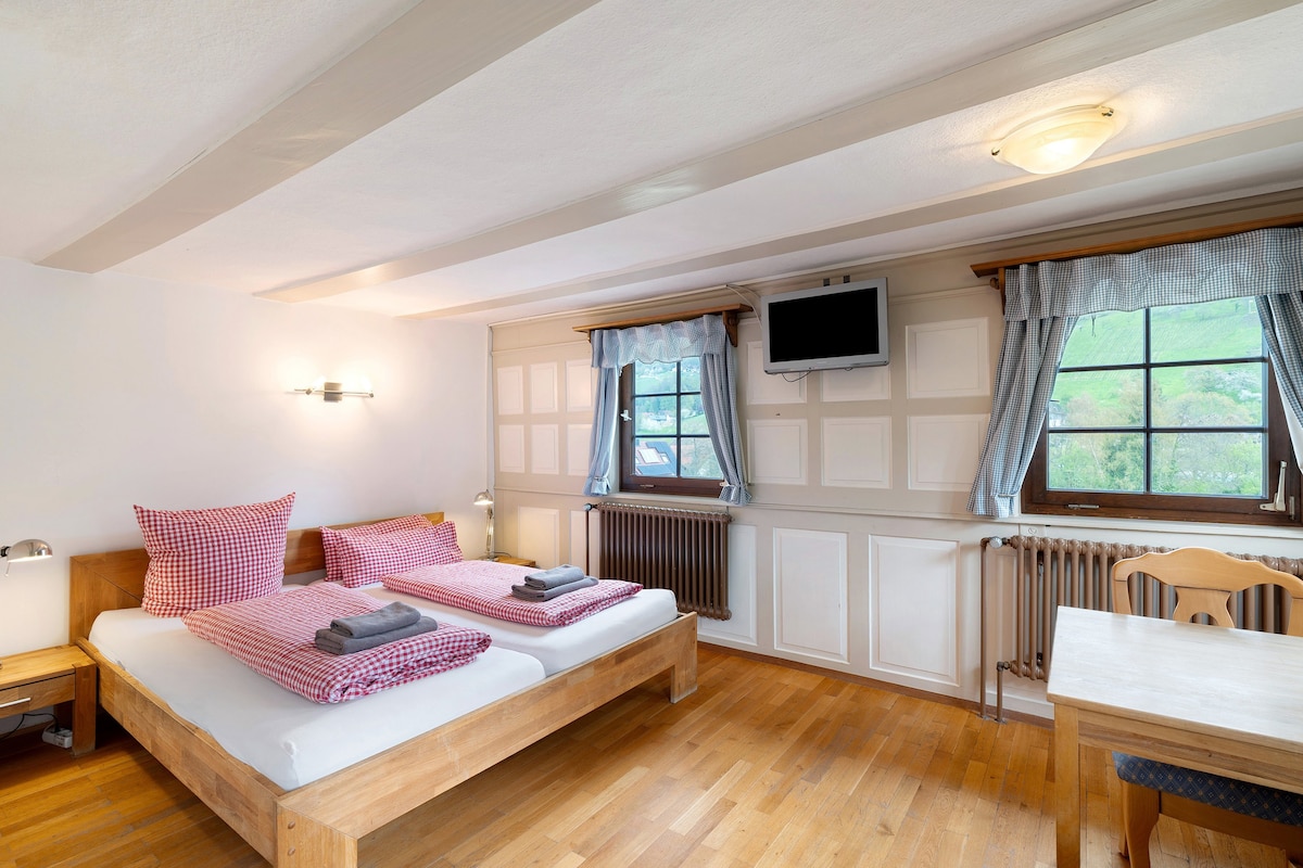 Den rolige hytta vår var en tidligere låve, som vi kjærlig gjorde om til en liten maisonette. Den tilbyr et fint, rolig sted for 2-4 personer. Huset er under tilsyn av foreldrene mine Rainer & Ursula, som også snakker litt engelsk og fransk. De er også kontakten på stedet og ønsker deg velkommen. Hagen er privat.