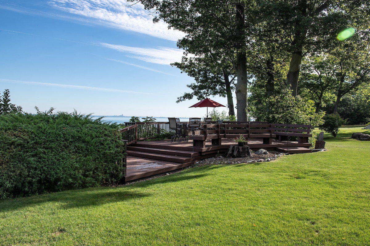 Dette huset ligger ved den fredelige bredden av Erie-sjøen, og tilbyr en rolig flukt og det perfekte stedet å nyte tid med familie, venner og kjære. Hjemmets eksteriør har store vinduer som gir fantastisk utsikt over vannet og sentrum av Buffalo. En romslig terrasse strekker seg fra hovedstuen, perfekt for utendørs bespisning, underholdning eller for å nyte et fredelig øyeblikk. Innvendig gjenspeiler interiøret en tidløs og komfortabel estetikk som er utstyrt for enhver anledning.