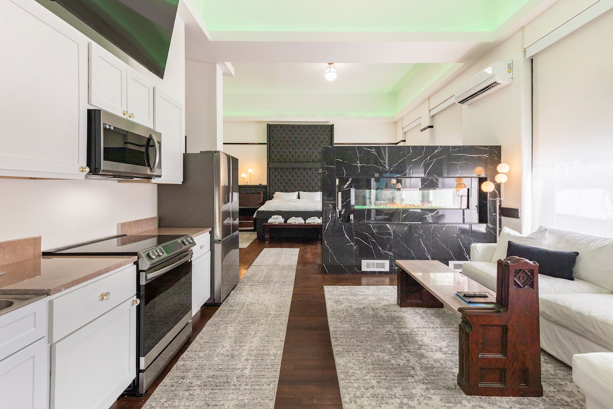 Opplev den unike luksusen! Perfekt for familie, forretninger eller romantikk. Med eksklusiv finish, 16-fots takhøyde og en fantastisk 6-fots peis utstråler dette stedet komfort og eleganse. Slapp av i det 5-fots runde badekaret, eller se en film på den 85-tommers smart-TV-en, mens du setter pris på bygningens historie. For de aktive gjestene er det en innendørs basketballbane og et treningsrom. Kontorområde for forretningsreisende. Sesongbasert takområde for solnedganger eller for å nyte været. Ekstra soverom kan legges til for større grupper.