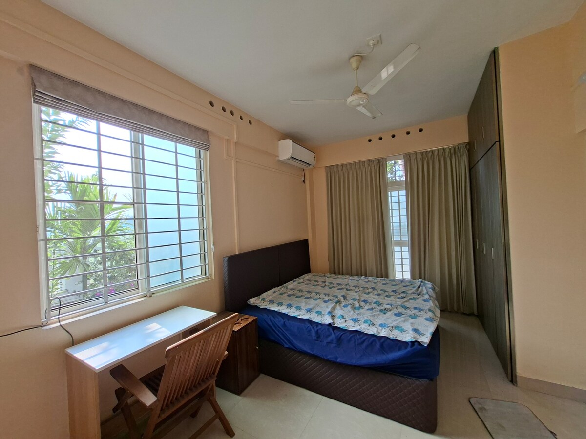 Velkommen til mitt rolige og koselige gjestehus med to soverom og kjøkken, med fullstendig komfort og privatliv, bortgjemt i et fredelig nabolag, men sentralt i Ernakulam City. Opprinnelig var det ment for mine personlige gjester, men nå er det kun åpent for familier og veloppdragne gjester. Hjemmet ligger i øverste etasje i den private bygningen min på tre etasjer, og tilbyr et komfortabelt opphold. Ett soverom har aircondition, og to balkonger gir godt naturlig lys og ventilasjon. Det er obligatorisk å oppgi KYC-opplysninger før innsjekking.