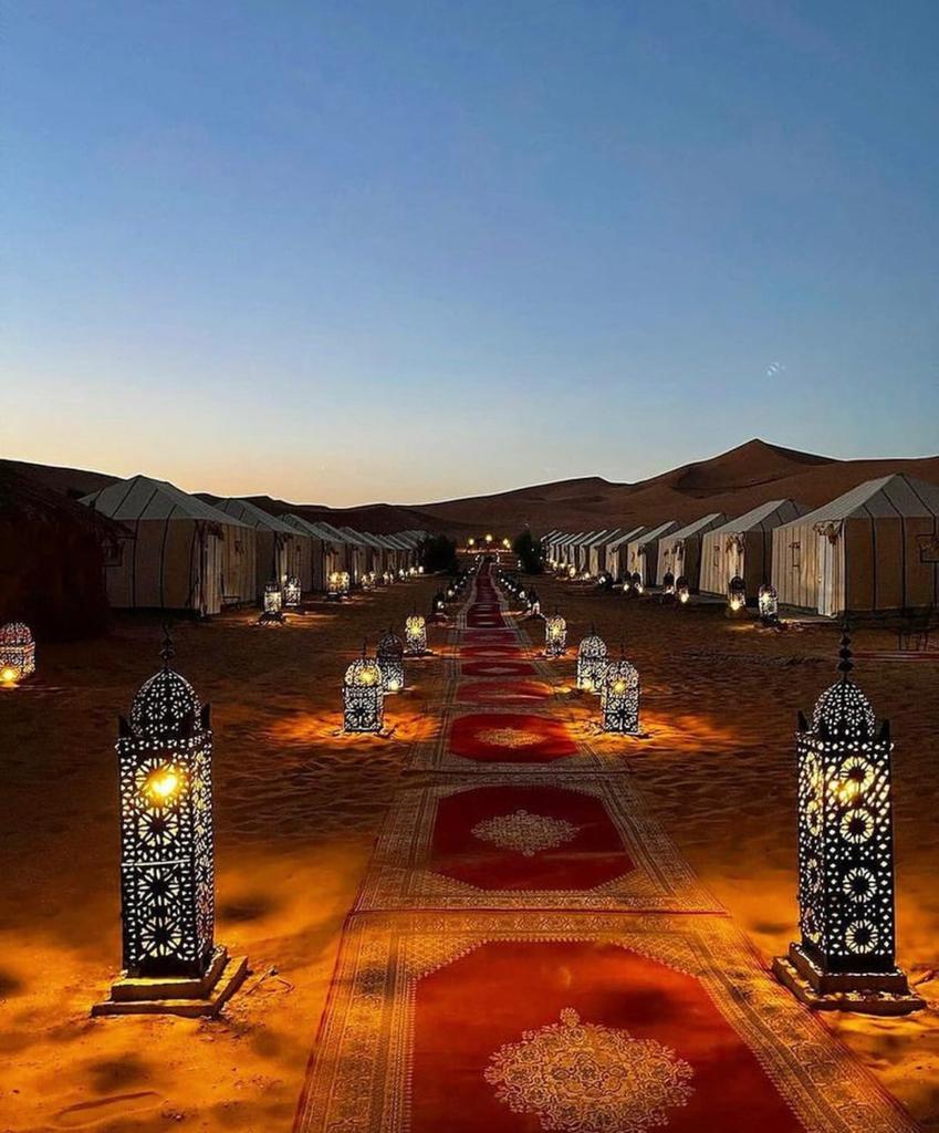 Velkommen til vår utsøkte ørkenferie i hjertet av Merzouga, hvor du vil oppdage Saharas magi i en ultimat komfort og stil. Enten du ser etter en romantisk ferie, et eventyr med venner eller en fredelig ferie, lover vår luksuriøse ørkenleir deg en uforglemmelig opplevelse.