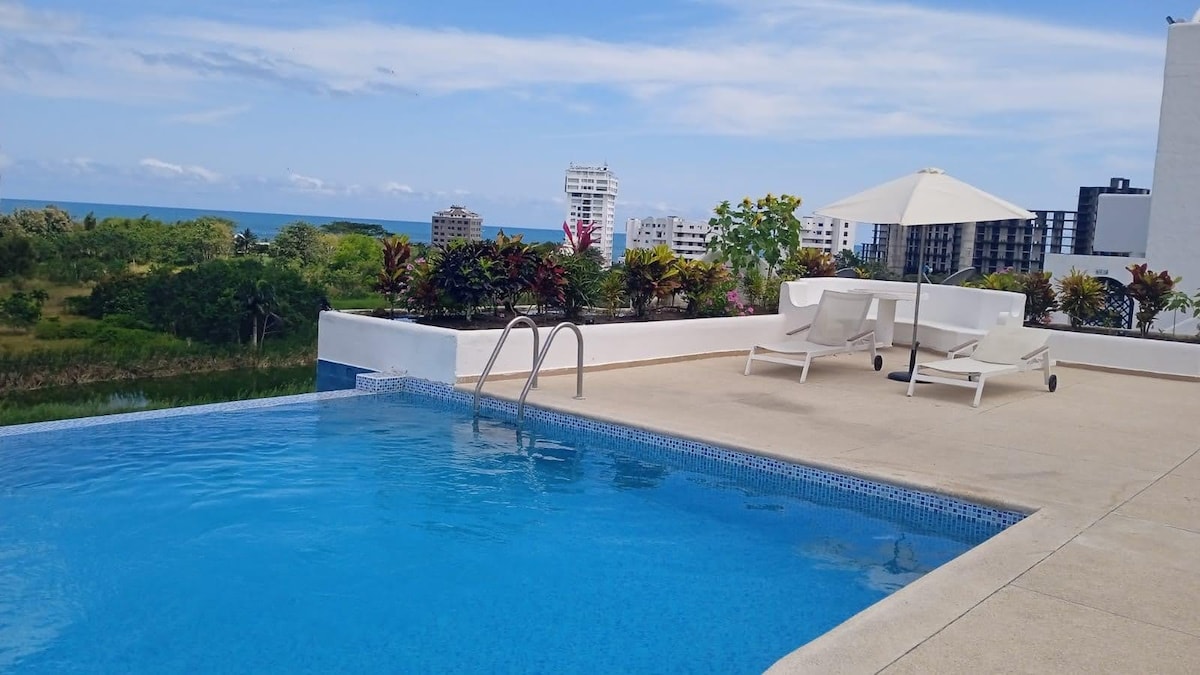 Denne stilige leiligheten med ett soverom i Tonsupa er det perfekte tilfluktsstedet for en ferie ved havet. Med et moderne og innbydende design, tilbyr den en lys stue, fullt utstyrt kjøkken og et komfortabelt soverom med en queensize-seng. Bare noen skritt fra stranden, vil du nyte nærheten til havet. Dette stedet er ideelt for avslapning, og kombinerer komfort og stil i idylliske omgivelser. Kom og lev en romantisk kystopplevelse!