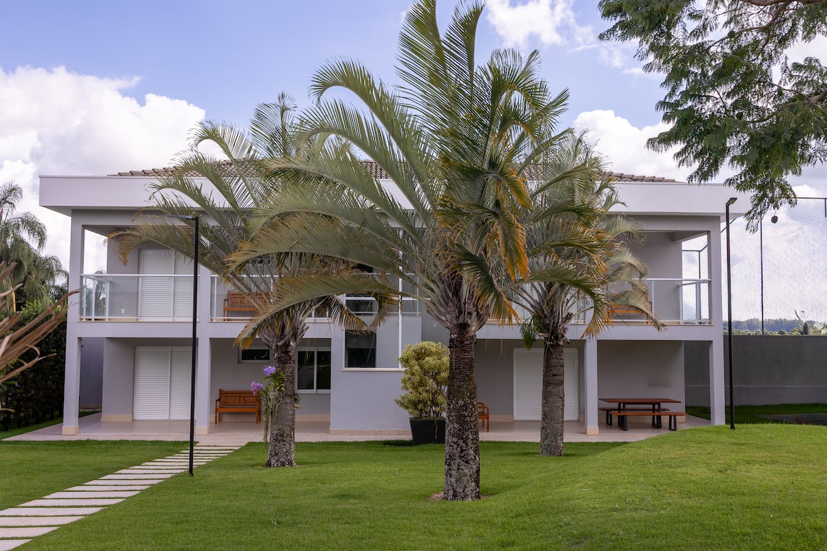 Slapp av med familie, venner og kjæledyr på denne koselige gården, som ligger i Recanto do Agreste, bare 6,2 km (13 minutter) fra Espírito Santo do Pinhal sentrum. Boligen har en døgnåpen concierge, mange bevarte grønne områder og gater uten fortau, som bevarer det rustikke og rolige klimaet i interiøret. Her finner du den perfekte balansen mellom privatliv, sikkerhet og kontakt med naturen — ideelt for de som ønsker å hvile, feire eller utforske regionens kaffe- og vingårder.