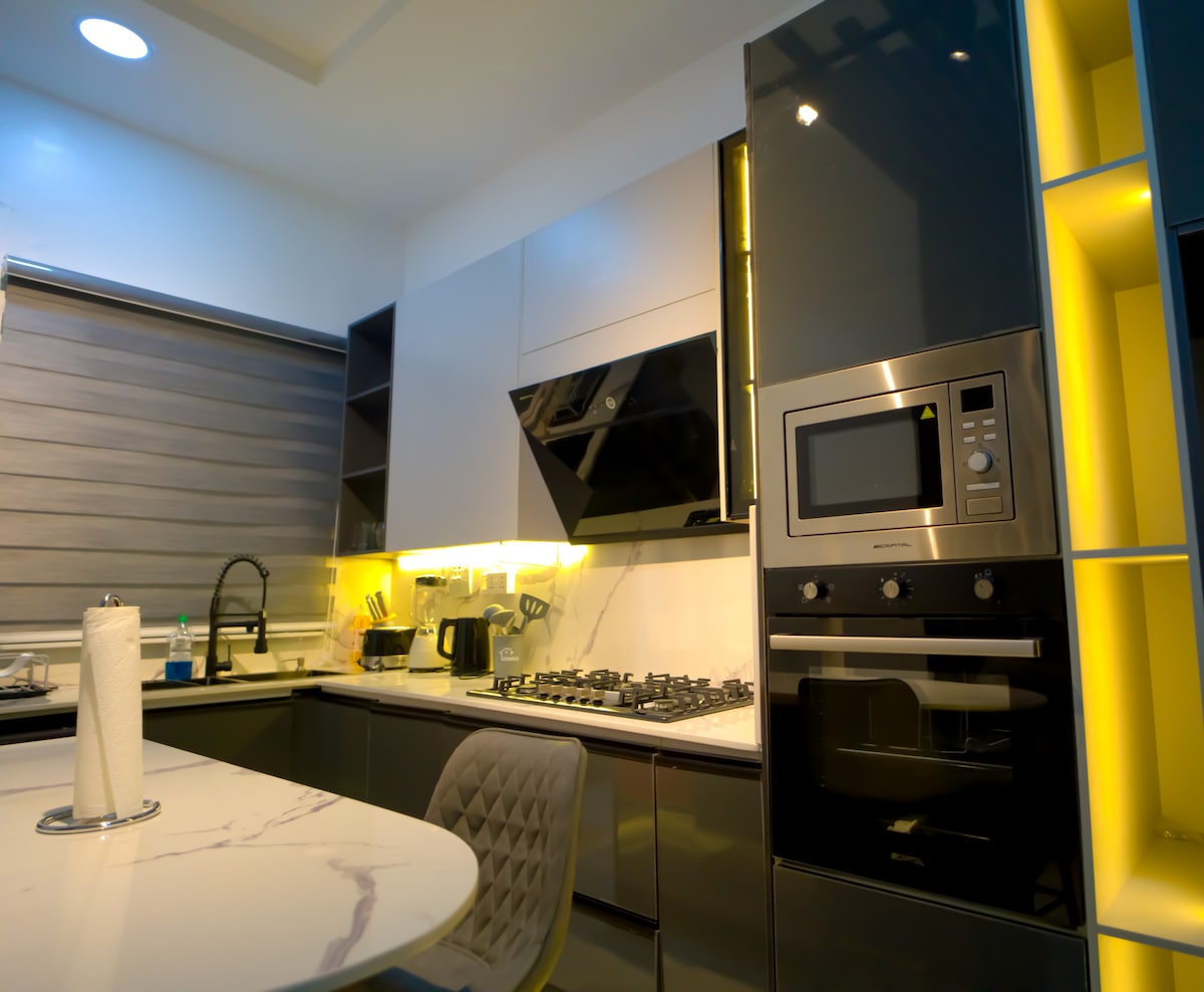Sjarmerende industriell karakter og førsteklasses hjemmekos. En rolig spasertur unna shopping, spisesteder og uteliv i Admiralty Way, Lekki Phase 1. Slapp av i svømmebassenget eller nyt filmer på satellitt, Netflix eller Amazon. Superraskt trådløst fibernettverk. Uavbrutt generatorstrøm-backup for 24/7 AC-komfort. Stille leilighet. Ikke egnet for sammenkomster. Strengt røykfritt. Ikke bestill denne leiligheten hvis noen av gjestene er røyker.