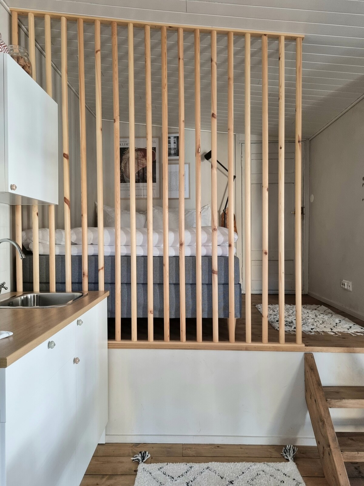 Leiligheten i hjertet av gamle Rauma er lys og høy (inkludert en hems), og gjesten har en flott sauna med et varmeapparat som varmes opp på kort tid. Leiligheten er personlig innredet, og vertens kjærlighet til gamle gjenstander er tydelig merkbar. Leiligheten har plass til fire personer: en dobbeltseng og to gulvmadrasser. I tillegg er det en sofa i leiligheten. Leiligheten er best tilpasset enslige eller enslige reisende, eller en liten familie.