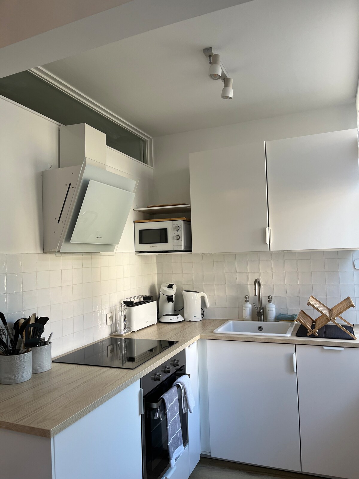 Stille og lys leilighet på 130 m2, nylig renovert (2021) med høyt støpte tak, i første etasje. Fullt utstyrt kjøkken som åpner inn i en stor spisestue i kontinuitet med stue, inngangsparti og arbeidsrom. Den duplex bakre delen av leiligheten har 2 vakre soverom, ett med en BEKA seng, et bad med dusj og badekar, et separat toalett og et lite utstyrt vaskerom. Vintagemøbler, varm og koselig atmosfære