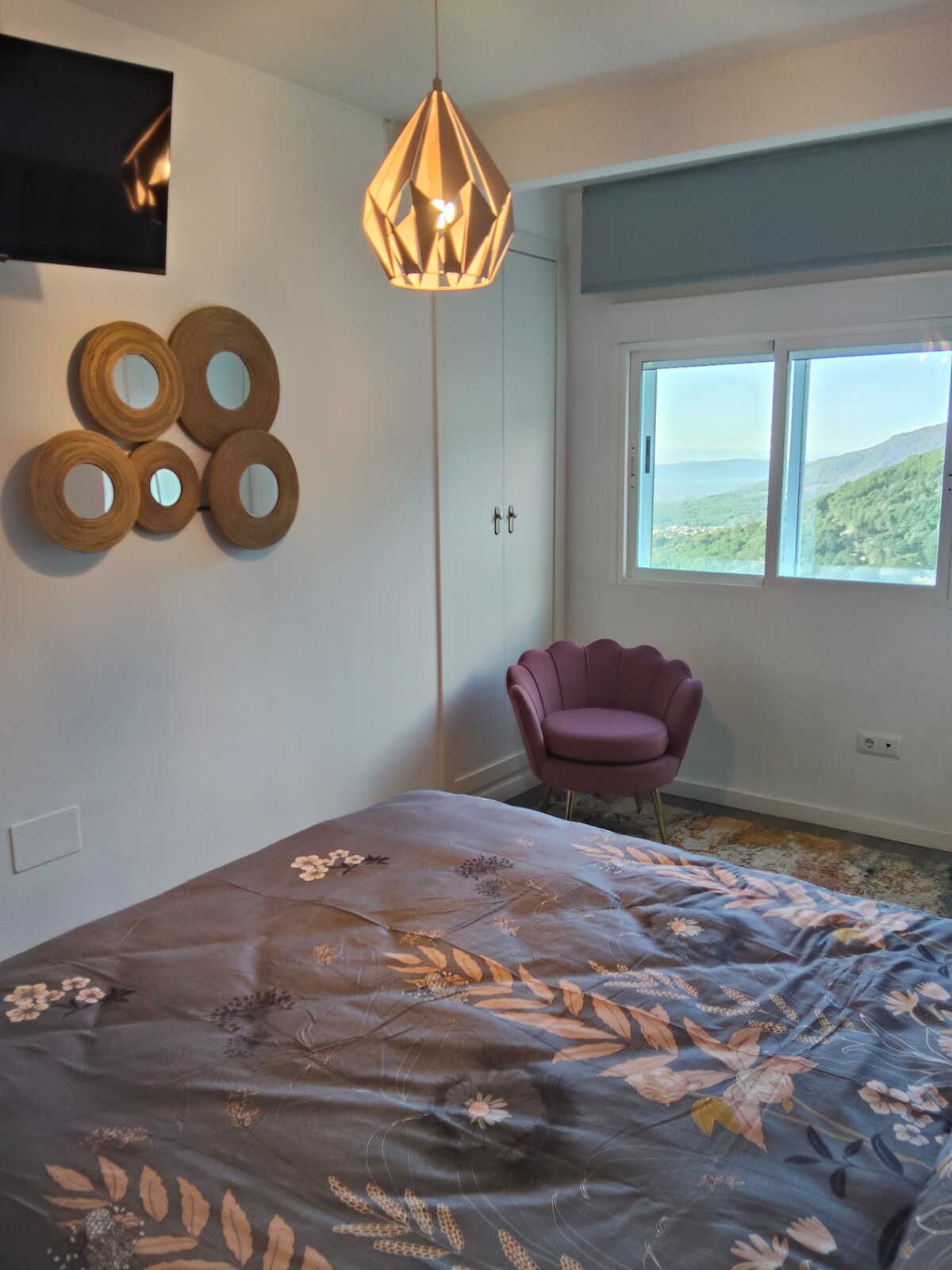 The apartment is a unique spot to enjoy the tranquility of Sierra de Aracena Natural Park with panoramic views over the surroundings countryside and a natural swimming pool (OPEN ALL YEAR ROUND). Go to sleep beneath an infinite canopy of stars and wake up to a chorus of birds... Stand-out features: - full kitchen and living space - stylish interiors - generous bedroom with ensuite bathroom - a large outdoor terrace - completely off-grid