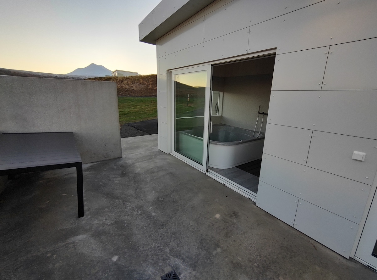 Registrert nummer:- HG-00020047. Hytta er 15 m2 og er en skjult nugget i hagen vår med utsikt over fjorden overfor Akureyri. Hytta ble fullført i april 2020. Det er et tekjøkken med vannkoker, mikrobølgeovn og kjøleskap. Toalettet er separat inne med et håndvask. Hytta er privat, og det er en halv wrap rundt dekk for å nyte kveldsutsikten og midnattshimmelen. Det er en utendørs dusj med varmt vann for en naturlig opplevelse. Alle produktene på hytta er duftfrie.