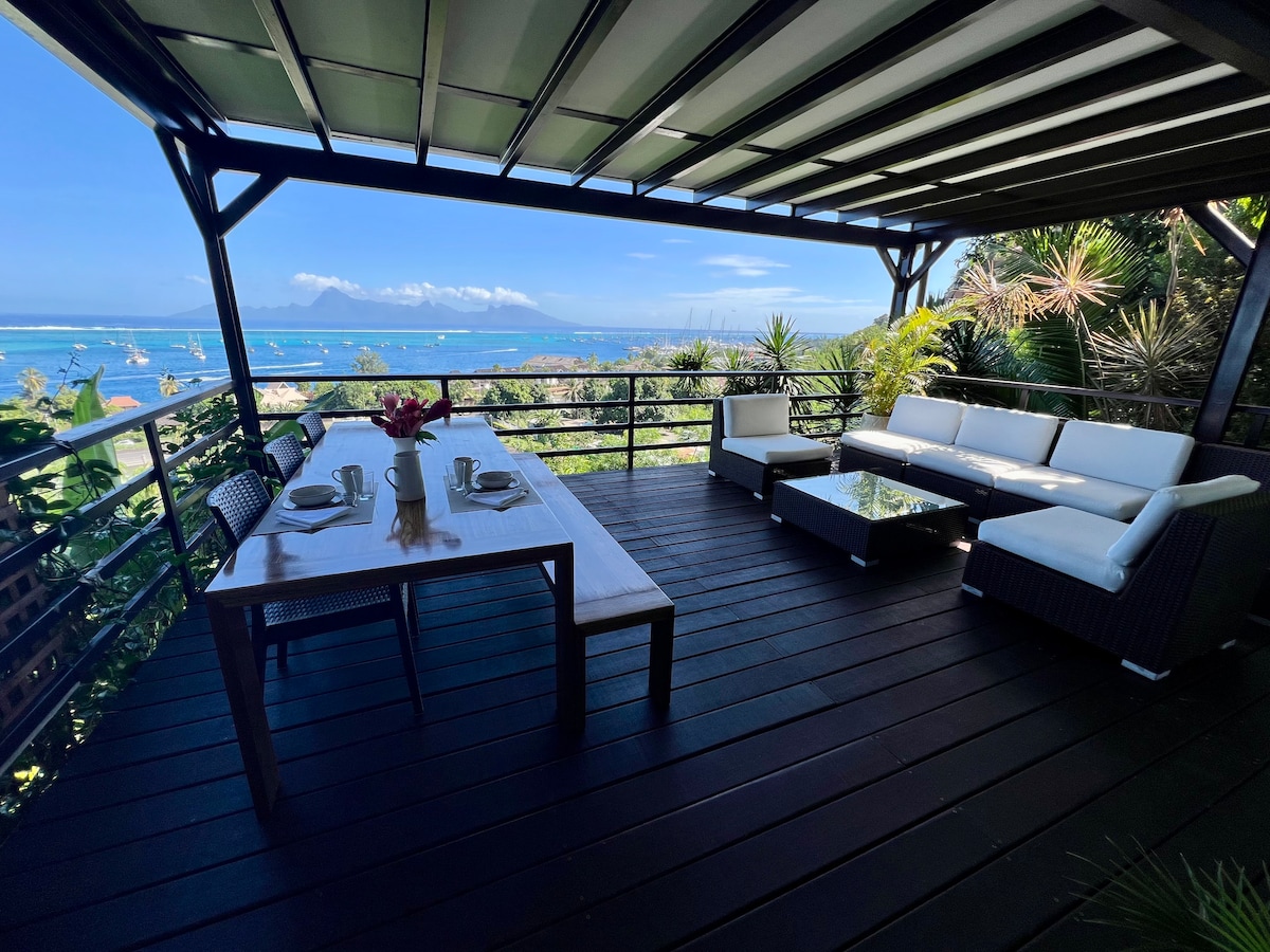 Vårt sjarmerende 85 m² store hus og 22 m² store terrasse gir deg en fantastisk utsikt over den fantastiske øya Moorea. Du kan slappe av i komfortabel omgivelse, samtidig som du har mulighet til å jobbe, takket være et motorisert skrivebord og en ekstra skjerm for å ha en dobbel skjerm med den bærbare datamaskinen din. Den gode internettforbindelsen gir deg mulighet til å holde kontakten med jobben din. Kom og opplev en unik opplevelse i dette huset hvor komfort og ferie går hånd i hånd.