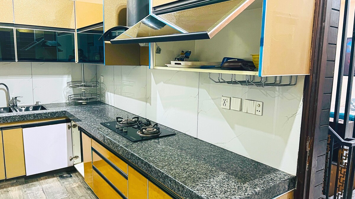 Dens 5-stjerners leilighet i første etasje ligger i et frodig grønt område på nedre kanalvei Faisalabad. Best for familier, forretningsreisende og grupper Det ligger veldig nærme alle attraksjoner som Kohinoor, D.ground og Lyalpur Galleria. Inngjerdet sikkerhet døgnet rundt Det er i første etasje med alle fasiliteter. To rom med klimaanlegg og tilhørende bad. varmt vann 1 stue Fullt funksjonelt kjøkken 🌙 trådløst nettverk + gratis Netflix Vaskeområde med automatisk vaskemaskin. Matleveringsfasiliteter i nærheten