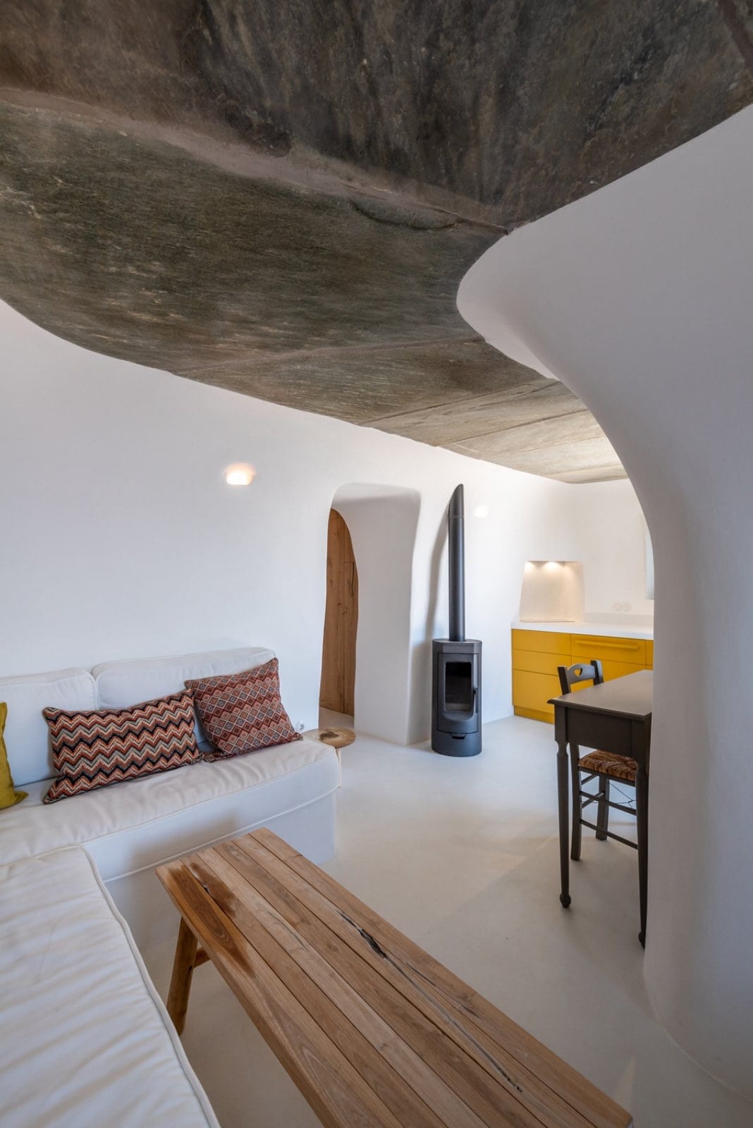 Dette 55 kvm miljøvennlige huset ligger 18 minutter med bil fra havnen i Tinos, på den vestlige siden av øya, i en olivenlund og flankert av steinete landskap og utsikt over Egeerhavet. Denne tradisjonelle gårdsbygningen har fått et nytt utseende i en minimalistisk stil. Stedet er ideelt for et par som elsker livet på landet og privatliv. Det gir en sjanse til å koble av fra bylivet og gjenopprette kontakten med enkelheten og roen i naturen og oppmerksomheten.