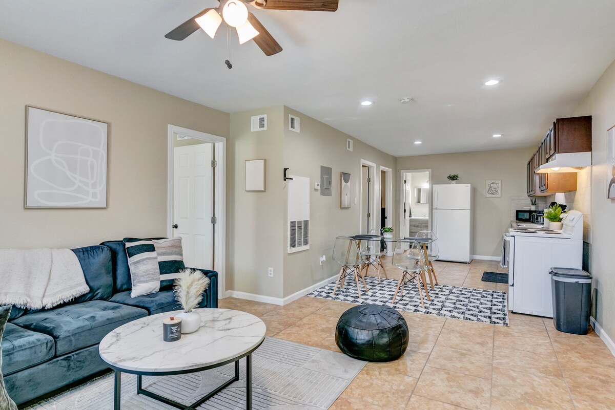 En Westend Condo, et kreativt kuratert tilfluktssted for kunstelskere og fredelige ferieopphold! • Viser frem lokale kunstneres verk • Cowboy Stock Tank-basseng – åpent 1. mars–15. oktober • fullt utstyrt kjøkken • trådløst nettverk med høy hastighet. • klesvask på stedet • Garasjeparkering med ladestasjon for elbil tilgjengelig (må be om på forhånd). Perfekt for kunstelskere, forretningsreisende og par som utforsker Sørøst-Texas. Kort kjøretur til Art Museum of Southeast Texas, Tyrrell Park, Cattail Marsh og Neches River. Bestill nå for å få et eventyr i Beaumont!