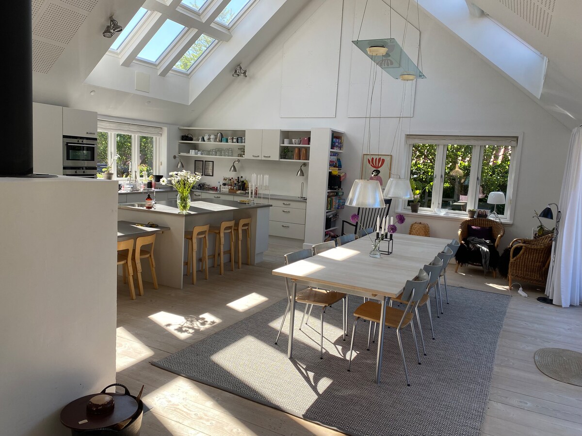 Stor lys familievennlig villa med stor sørvestvendt terrasse i lukket hage. Husets hjerte er det store, lyse, åpne kjøkkenet med opptil ti tallerkener og direkte tilgang til terrassene. Vi bor på en rolig, blindvei, gangavstand til den beste stranden, skogen, kafeer, shopping og 5 km fra Aarhus C. Villaen er med over 300 m2 egnet for eksempel to familier. Det er opptil ti gode soveplasser.