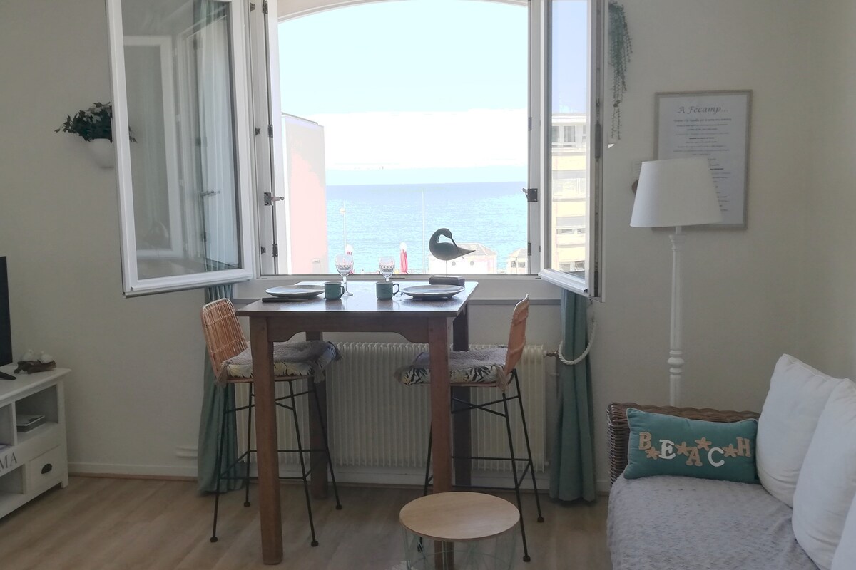 Velkommen til FECAMP! Leiligheten ligger 12 minutter fra jernbanestasjonen, og er på 36 m2 i 2. etasje i et stort hus hvor du nesten har føttene i vannet. Bare gå ned fra eiendommen, gå 50 m til fots, og du er der. Bli vekket av lyden av måker, stå opp og gå til stranden, gå til markedet... Ha hele Fécamp rett utenfor døren... strand, butikker, restaurant, fiskemarked, kasino,... du trenger ikke bil!