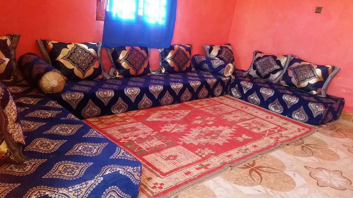 Jeg bor sammen med familien min i utkanten av Hassilabied, en landsby noen få kilometer fra Merzouga. Vi har et enkelt, tradisjonelt hus med et privat rom tilgjengelig for deg å sette bagasjen din og ta bare en liten ryggsekk, for ørkenen. Men badet deles med andre gjester, og vi vil gjerne dele vår marokkanske gjestfrihet med deg! Vi har et gjestehus. og ørkenleir, og kamelturer. Vi tilbød deg to forskjellige ørkenleirer, standard og luksus. Det er forskjellige priser.