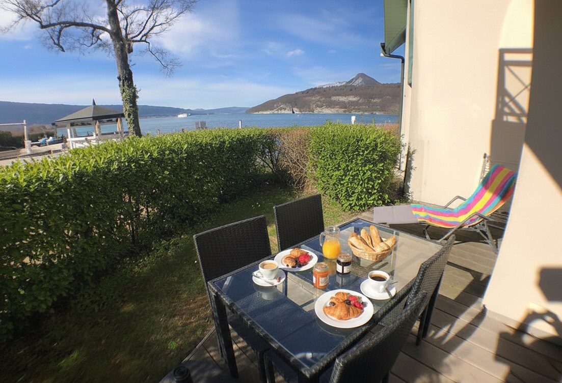 Vakker, lys og selvstendig leilighet med utsikt over innsjøen på 70 kvm i første etasje med tilgang via trapp. Beliggende ved innsjøen 150 meter fra stranden. Nær Annecy, 15 minutter. Romslige oppholdssteder for 4–6 personer, to soverom + TV-er, et bad med dobbel vask + dusj, hengende toalett, utstyrt kjøkken åpent til stuen + dobbel sovesofa, spisestue. En privat garasje + sykkelrom + privat terrasse med syntetisk gress. Innsjekking uten vert med nøkkelboks 🏕