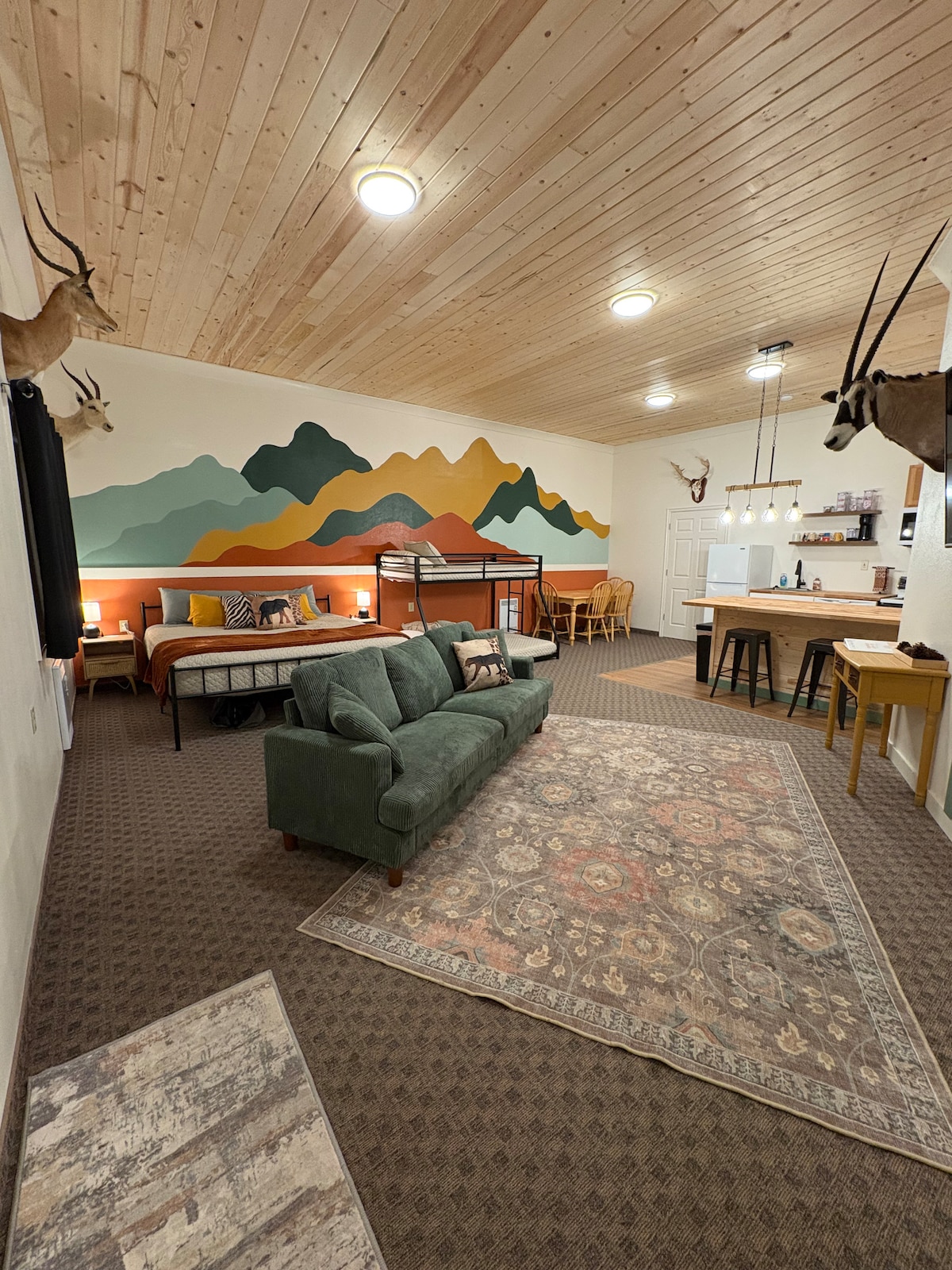 Experience a modern South African–inspired safari lodge in the heart of Koosharem. This newly renovated studio features tasteful wildlife mounts, a king bed, bunk beds, and a full kitchen. Family-friendly and perfectly located between Bryce Canyon and Capitol Reef, it’s the ideal base for adventure and relaxation.