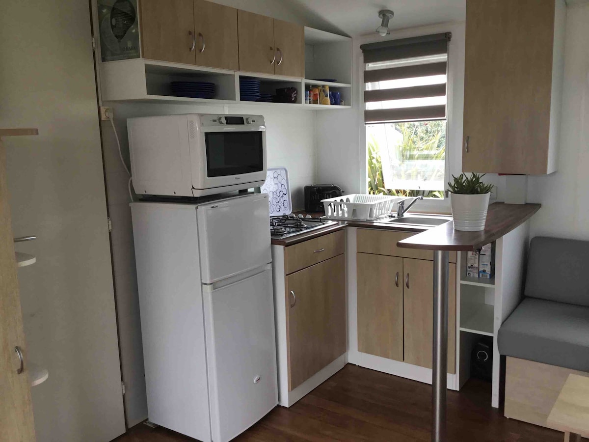 Bobil for 6 personer med 3 soverom, som ligger innenfor 3-stjerners Camping La Baie du Kernic i Plouescat Finistère Nord med et oppvarmet innendørs svømmebasseng fra april til september og et utendørs svømmebasseng åpent fra juni til september. Kjøkkenet er utstyrt for 6 personer og inkluderer en mikrobølgeovn, kjøleskap, en 4-brann gass komfyr, mini stekeovn, klassisk kaffetrakter, vannkoker + Dolce Gusto kaffetrakter, TV. Treterrasse med barriere med ett bord og seks stoler.