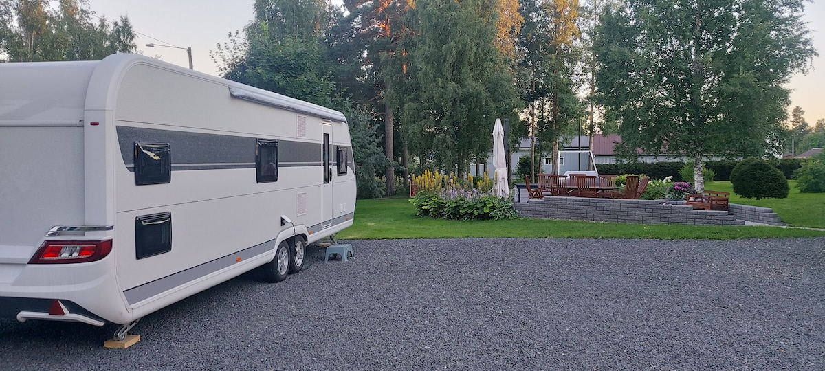 En velutstyrt campingvogn i nærheten av skogen, i et rolig område, i hagen til et enebolig. Lekeutstyr for barn og trampoline på gårdsplassen. Nær godt utendørsterreng og en idrettsbane med utendørs idrettssted. Svømmeplassen ligger i gangavstand, den vårbaserte Sorse-dammen.