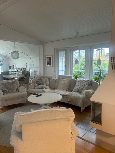 Ta med hele familien eller vennene til dette fantastiske stedet med mye plass til moro skyld. Mange aktiviteter i nærheten, bouldering, vannsport, discgolf og ekte golf. Huset i to etasjer er veldig sjenerøst med åtte senger, hvorav det ene er en dobbeltseng fordelt på tre soverom i øverste etasje. Ovenpå er det også et bad med toalett samt dør ut til balkongen. Nedenunder er enda mer romslig med et stort spisebord for ti personer. Fullt utstyrt kjøkken samt vaskemaskin og tørketrommel.