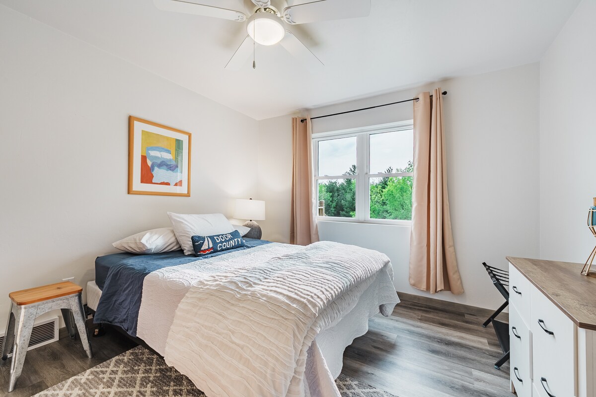 Første etasje, tilgjengelig leilighet med ett soverom. Romslig bad med nyflislagt dusj, to flatskjerm-TV-er med kabel-TV. Komplett kjøkken har nye apparater (kjøleskap, komfyr, stekeovn og oppvaskmaskin), benkeplater i kvarts, mikrobølgeovn, kaffetrakter + brødrister. Privat uteplass kobles til romslig felles hage med lysthus, utebord og stoler, griller og nydelig vannfontene (kjører bare sent på våren og sommeren). Sentralt plassert til alt i Door County!