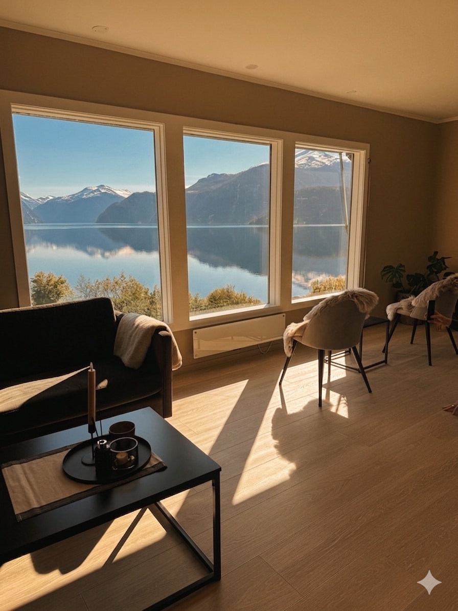 Valldal Panorama is a modern cabin located in the heart of Valldal. The cabin offers 5 bedrooms, 8 sleeping spaces and 2 bathrooms. Welcome to a place where the fjord reflects the sky, the mountains protect the silence, and each day is allowed to anfold as slowly as your soul desires. Perfect for large families. Situated close to UNESCO World Heritage sites like the iconic Geirangerfjord, this cabin offers easy accsess to some of Norways most breathtaking and protected natural landscapes.