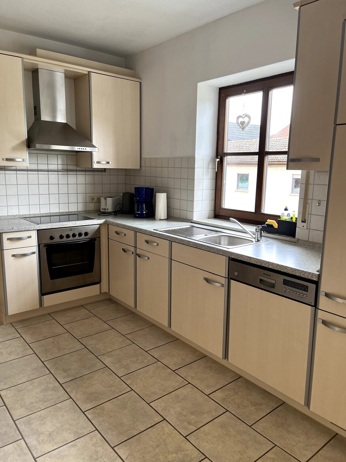 This comfortable 108m² ground-floor apartment (barrier-free) boasts a charming village-like location on the outskirts of town,with easy access to the baroque city of Fulda and the nearby Rhön region. In addition to two bedrooms and a children's room,the apartment features two bathrooms.The spacious living room,equipped with a 55-inch smart TV,open-plan dining area and fully equipped kitchen,is sure to impress.The cozy ambiance of a wood-burning stove and a bathtub invite you to relax and unwind.