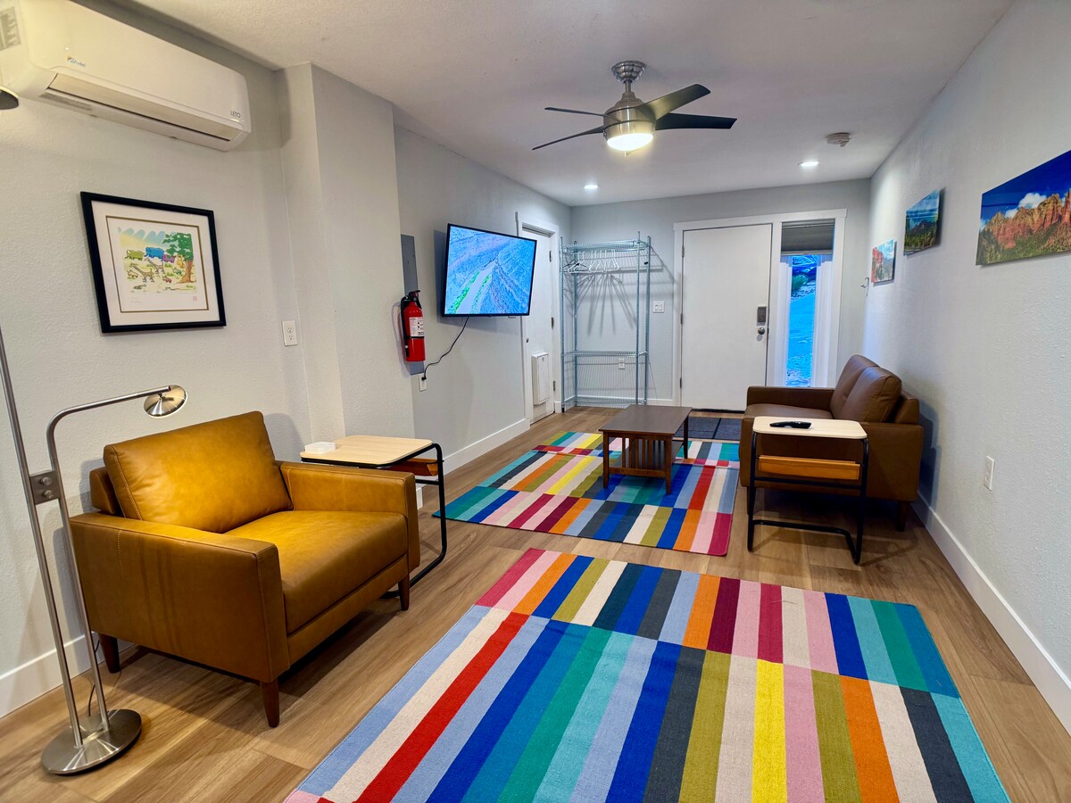 Velkommen til The Treehouse! Denne sjarmerende studioleiligheten på 600 kvadratfot tilbyr et fredelig tilfluktssted, fylt med unik kunst og ideelt for én eller to gjester. Den har en koselig queensize-seng, et velutstyrt kjøkken, et bad og to innbydende sittegrupper. Nyt bekvemmeligheten av å ha verten i nærheten, med muligheten til å bli med meg på terrassen på baksiden for kaffe eller et måltid i gourmetkjøkkenet mitt. Sentralt plassert for enkel tilgang til Grand Canyon, Sedona, Page med mer. Jeg ser frem til å ønske deg velkommen!