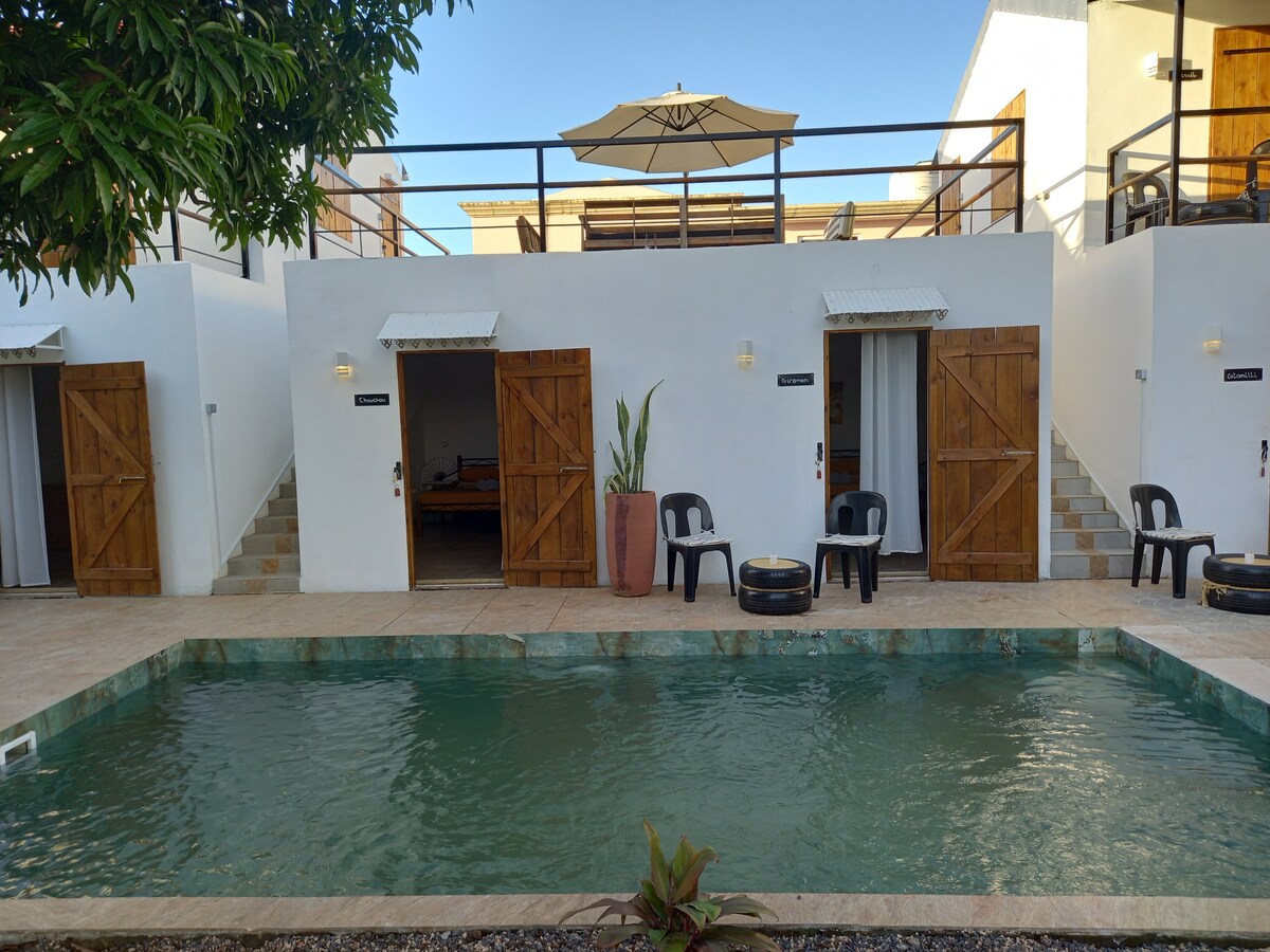 Dette unike stedet har sin helt egen stil. Du har din egen plass på taket med den vakre solnedgangen uten nabolag, marked, strand og restauranter 10 til 20 minutter med spaserturer, og godt utstyrt kjøkken alt du trenger, bad med varmt vann, og alt for å gjøre oppholdet ditt komfortabelt.