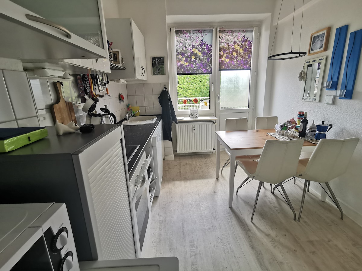 Moderne og koselig leilighet i Düsseldorf-Angermund. Ideelt for par, forretningsreisende og turister som besøker Düsseldorf. Bare ett stopp fra flyplassen, i nærheten av messen og det historiske distriktet Kaiserswerth. Komfortabelt møblert med en seng i heltre og en EMMA-madrass, et skrivebord og et fullt utstyrt kjøkken. Lys stue og sitteplasser på solterrassen rett foran leiligheten. Gratis parkering er tilgjengelig, med ladestasjon for elbil (ved forespørsel).