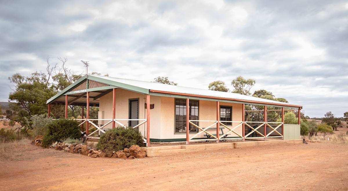 Vår bittesmå, svært minimalistiske hytte med selvbetjening ved foten av Mt. Remarkable i Sør-Australia passer for to personer. Det er kun én seng på størrelse queen size på soverommet. Vi leverer sengetøy og håndklær. Badet har badekar, toalett og dusj, og det er et toalett utenfor. Svært grunnleggende innkvartering (kom deg vekk fra livets rot). Vi har bestemt oss for å fortsette med kjæledyrvennlig hus, men du må gi oss beskjed (vi har hatt hunder som har sneket seg inn. Ved siden av er det hunder som vil bjeffe og prøve å hoppe over gjerdet.