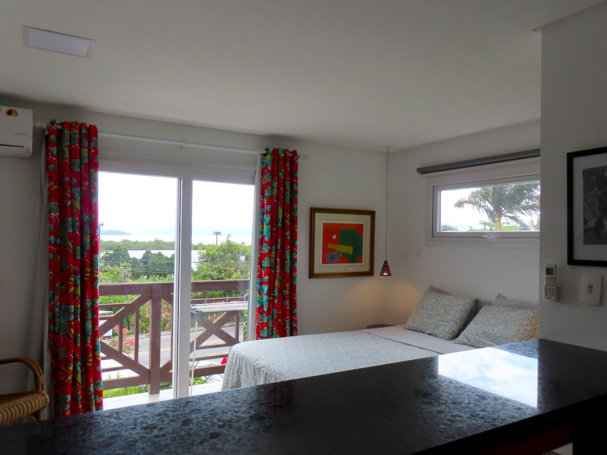 Estúdio com varanda e com linda vista para o mar. Perfeito para casais. Completo e aconchegante. Localizado a 5 min. caminhando até a Praia de Ponta das Canas conhecida por seu mar calmo, de temperatura amena e areia branca. Equipado com cama queen, Tv Smart, ar-condicionado, internet WiFi de alta velocidade, cozinha compacta e banheiro. Estacionamento de uso exclusivo para hóspedes no local. Próximo as principais praias do norte da Ilha (Praia Brava, Lagoinha, Canasvieiras, Jurerê...)