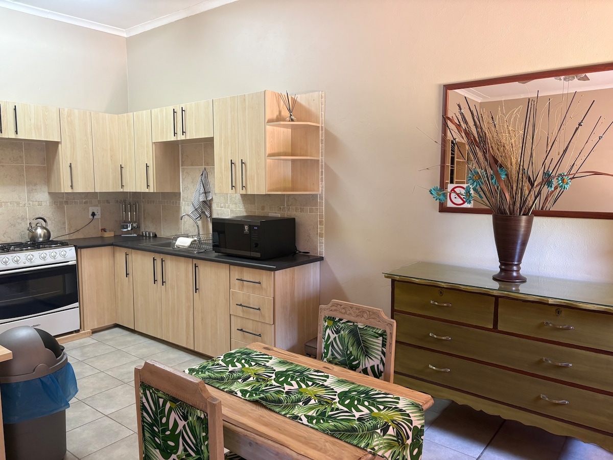 Denne eksklusive enheten er perfekt for et hjem hjemmefra. Lås og gå, trygg forstad, beliggende i en vakker hage. Enkel tilgang til motorveier. Komfortabel king size-seng for god nattesøvn. Egnet for kort- eller langtidsutleie, hjemmeferie, feiring eller forretningsreise. Betjent daglig unntatt søndager og helligdager! Enheten har én parkeringsplass. Lys, TV og trådløst nettverk er tilgjengelig under strømbrudd! Eiendommen har et borehull med renset vann. Enheten har klimaanlegg.