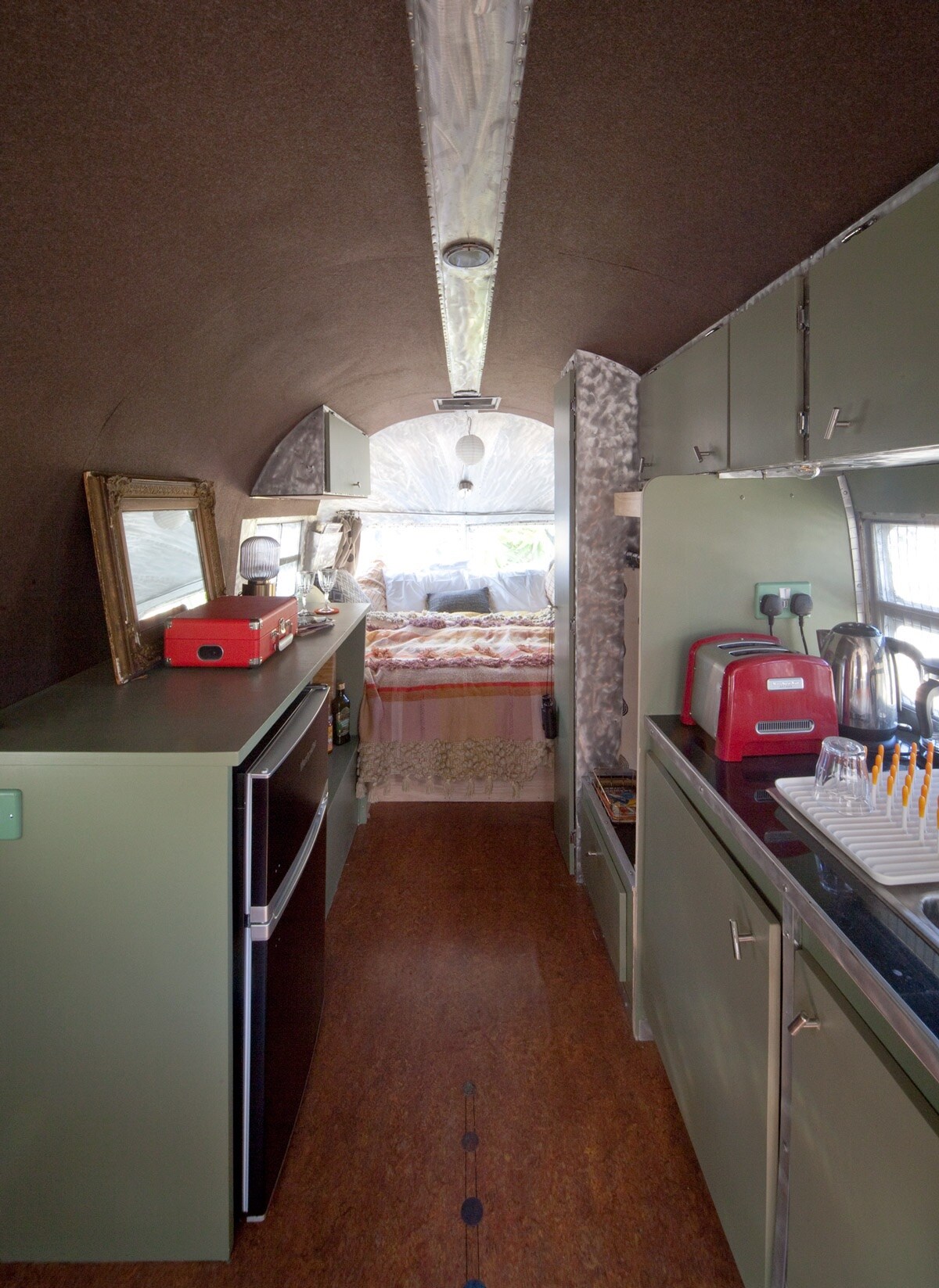 Unik vintage Airstream-campingvogn ved siden av stranden