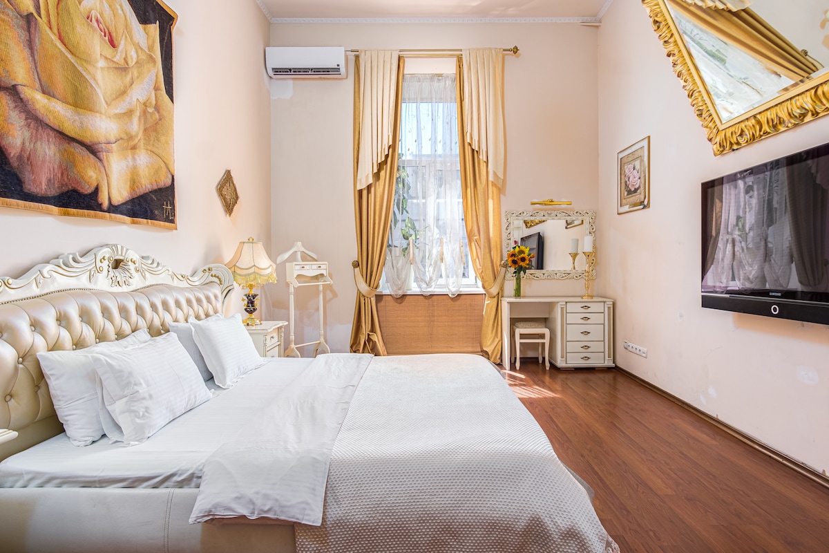 Leiligheten ligger i sentrum av byen. Derybasivska street, Opera teater, Katerynynska torget og alle de beste restaurantene i Odesa ligger i gangavstand. Leilighetens totale areal er 50 m2. Leiligheten er laget med designerreparasjoner. Høyhastighets Internett Wi-Fi, Internett TV er satt opp. Det lyse, elegante kjøkkenet er utstyrt med vakre innebygde møbler og apparater, vannfilter, kaffemaskin. Stor sovesofa og TV-sett Smart-TV, klimaanlegg, garderobe er plassert i stuen. På soverommet - king size-seng, TV Smart TV, klimaanlegg, garderobe, inngang til balkongen. Badet har dusjkabin og vaskemaskin. Varmt vann er tilgjengelig døgnet rundt (autonom oppvarming). Det er mange butikker i nærheten, parkering for betalt parkering.
