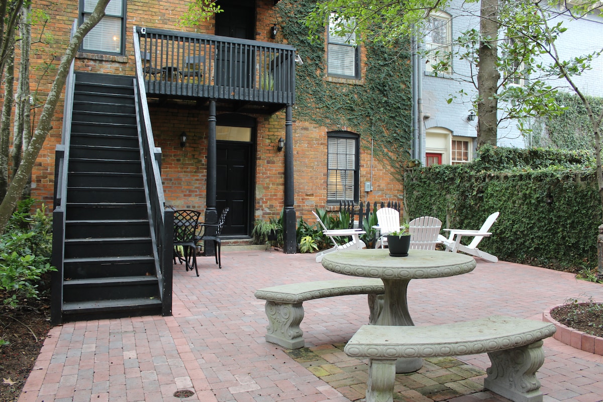 Nyt en stilig, romantisk opplevelse på dette sentralt beliggende vognhuset med ett soverom. Egen inngang med enkel gateparkering i nærheten. Gå til alle de beste Savannah-restaurantene og spasere gjennom Forsyth Park som ligger to kvartaler unna. Du vil sovne til de lullende lydene av gårdsplassen fontenen, slappe av i interiøret designet av 1chicretreat.com, og vil ønske å flytte til Savannah snart nok! Dette er et vognhus, så det er femten (15) trinn for å komme inn. SVR-02520