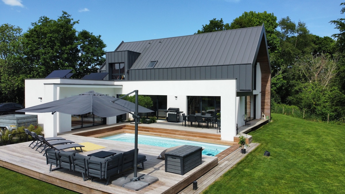 Huset vårt er et arkitektonisk hus, vi har lagt stor vekt på utformingen og integrasjonen i naturen. En sjelden særegenhet er den mobile terrassen som oppdager et oppvarmet basseng skjult under denne 50 m2 treterrassen. Vi trykker på en knapp, og hun kan bli oppdaget uten anstrengelse... Oppvarmet basseng, utstyrt kjøkken, grill, én dusj og én badekar, toaletter. Kvalitetssikret service av vakker kvalitet!